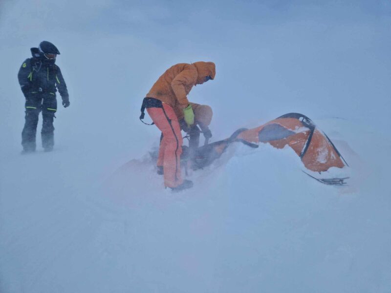 Fólkið hefur verið flutt í skjól og unnið er að því að ná búnaði þeirra niður af jöklinum.