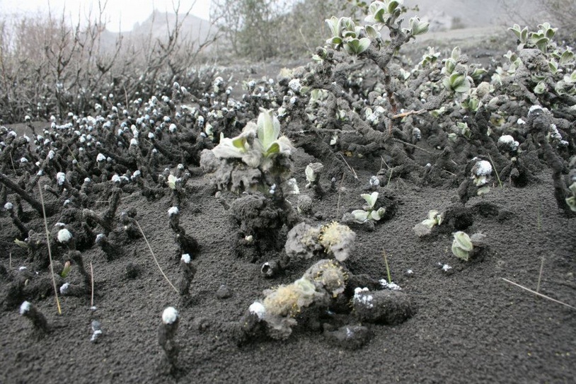 Önnur myndin er af víði sem fór á kaf í ösku eftir eldgosið en nokkrum dögum eftir öskufallið fór að sjást í græn víðiblöl uppúr öskukápunni. Hvítu „hattarnir“ á víðinum eru kristallaður brennisteinn.