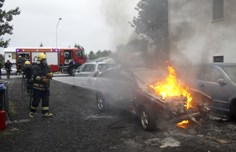Eldur kom upp í bifreið sem verið var að rífa við íbúðarhús við Eyraveg á Selfossi á sjöunda tímanum í kvöld.
