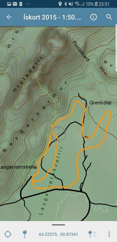 Hér fyrir neðan má sjá kort þar sem búið er að teikna upp brautina. Fyrir aðgengi er best að stefna að aðsetri Hellisbúanna, The Cave People, við Laugarvatnshelli.
