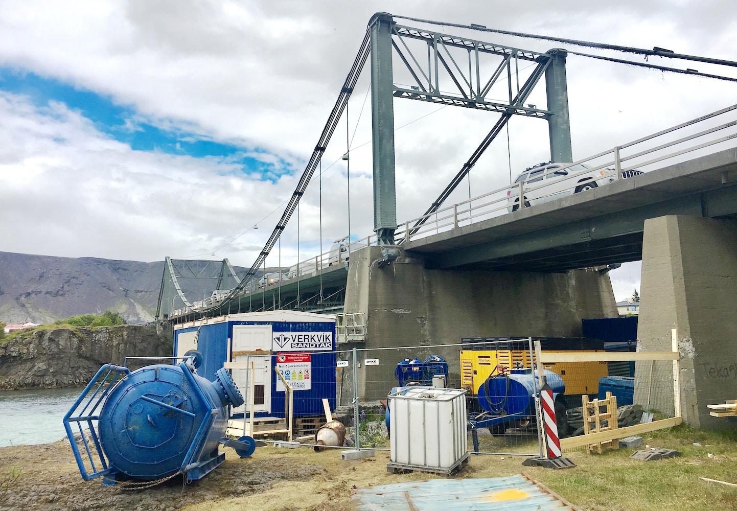 Vegagerðin vinnur nú að undirbúningi viðhaldsframkvæmda á Ölfusárbrú. Um er að ræða sandblástur og málun stálgrindar undir brúnni.