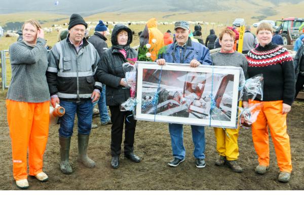Það voru ráðskonurnar Þórhalla í Þjóðhólfshaga, Ólafía í Húsagarði og Hilda frá Læk ásamt Kristni Guðnasyni fjallkóngi sem afhentu Olgeiri og Guðnýju Finnu konu hans mynd tekna af Ragnari Axelssyni. Myndin sýnir Olgeir í Geimstöðinni í hráslagalegu veðri við smölun á Landmannaafrétti.
