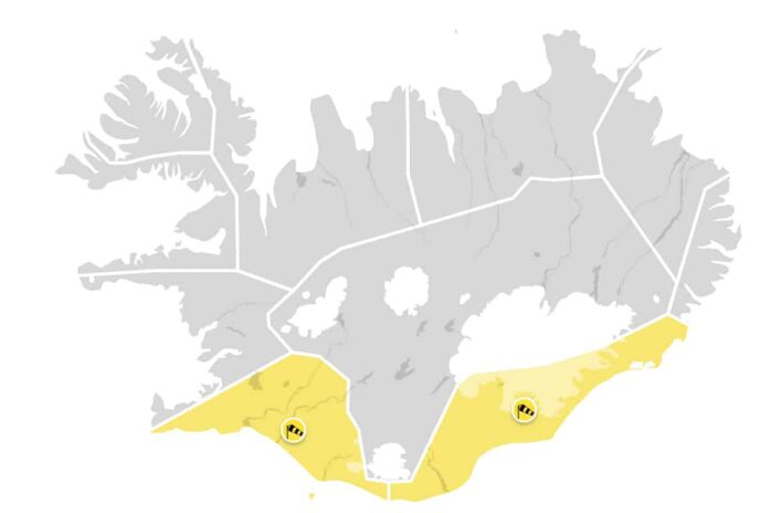 Á Suðausturlandi tekur viðvörunin gildir kl. 20 á sunnudagskvöld og gildir til klukkan 14 á mánudag. Hvassast verður í Öræfum en vindhviður allt að 35-40 m/sek við fjöll.