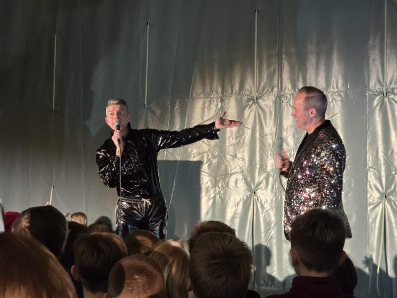 Listamaðurinn Páll Óskar var fenginn til að koma óvænt á svið í íþróttahúsi Vallaskóla á Selfossi á jólasamveru í gær.