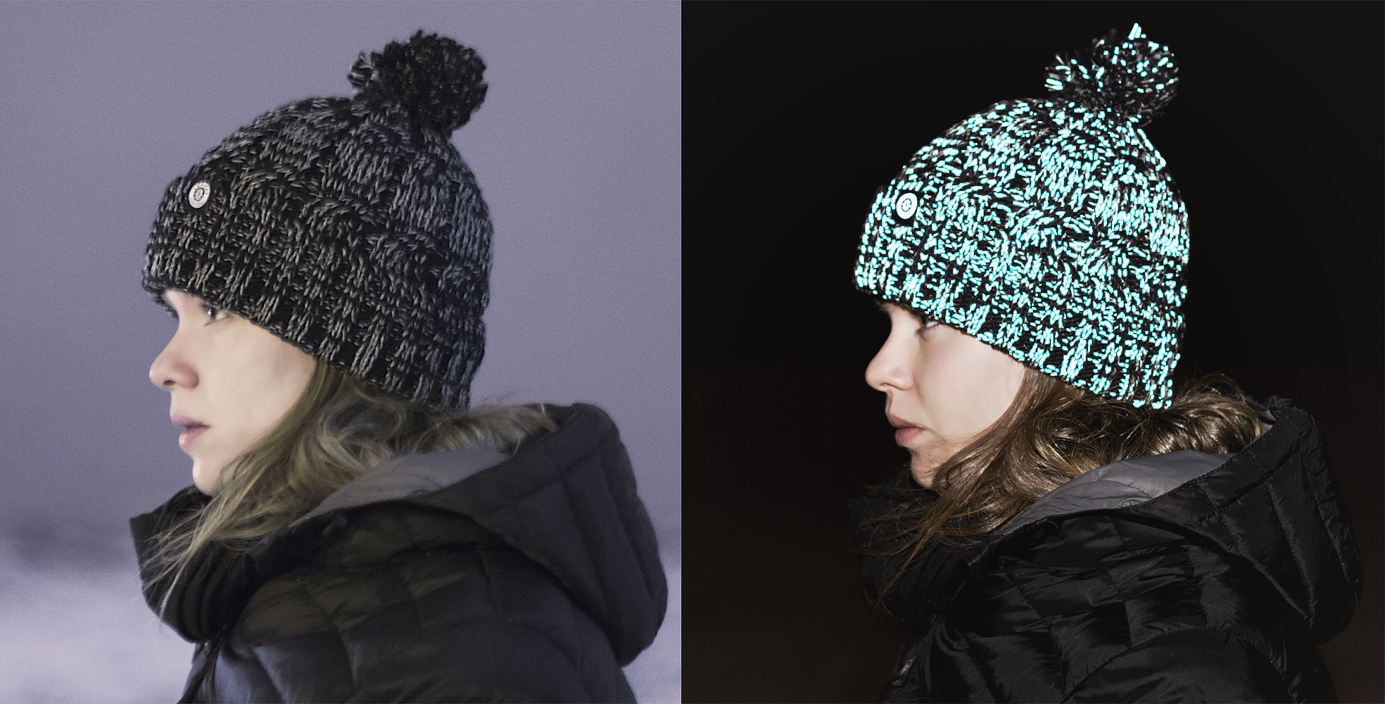 Engin hefðbundin endurskinsmerki eru á húfunum. Endurskinið kemur frá þræði sem er húðaður með öflugu endurskinsefni og prjónaður með hefðbundnu garni. Þráðurinn er grannur og illsjáanlegur. Hann fellur vel að litum og munstri húfunnar og endurkastar frá sér ljósi sem á hana fellur þannig að húfan virðist glitra og verður vel sýnileg í myrkri.