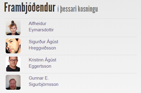 Frambjóðendurnir eru Álfheiður Eymarsdóttir, Gunnar E. Sigurbjörnsson, Kristinn Ágúst Eggertsson og Sigurður Ágúst Hreggviðsson.