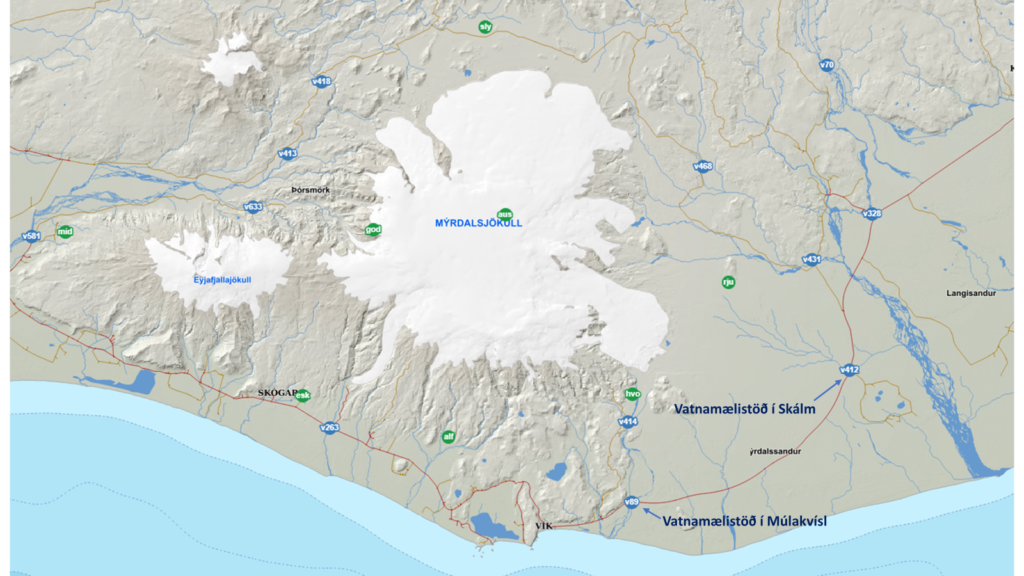 Hér fyrir neðan er mynd sem Mýrdalsjökul og umhverfi ásamt staðsetningu mælanna en bláir mælar eru vatnamælar og grænir jarðskjálftamælar.