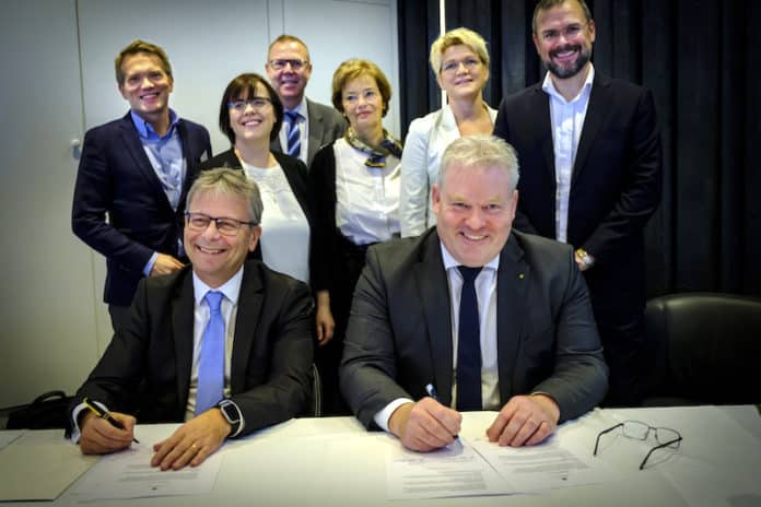 Sigurður Ingi Jóhannsson samgöngu- og sveitarstjórnarráðherra og Jón Atli Benediktsson, rektor Háskóla Íslands, undirrituðu samstarfssamning þar að lútandi á aðalfundi Samtaka sunnlenskra sveitarfélaga á Hótel Örk í dag.