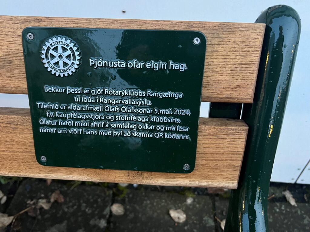 Rótarýklúbbur Rangæinga færði íbúum Rangárvallasýslu á dögunum forláta bekk til heiðurs Ólafi Ólafssyni, fyrrverandi kaupfélagsstjóra en hann varð 100 ára þann 5. maí síðastliðinn.