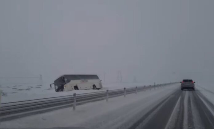 Rúta með 28 manns innanborðs fór útaf Suðurlandsvegi á Hellisheiði um miðjan dag í dag. Enginn slasaðist og farþegum rútunnar hefur verið komið í skjól.