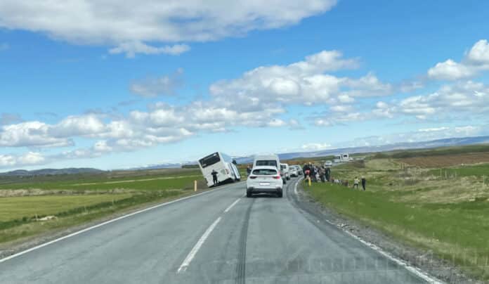 Farþegarnir úr rútunni voru fluttir að Efsta-Dal eftir óhappið og kenndi sér enginn meins.