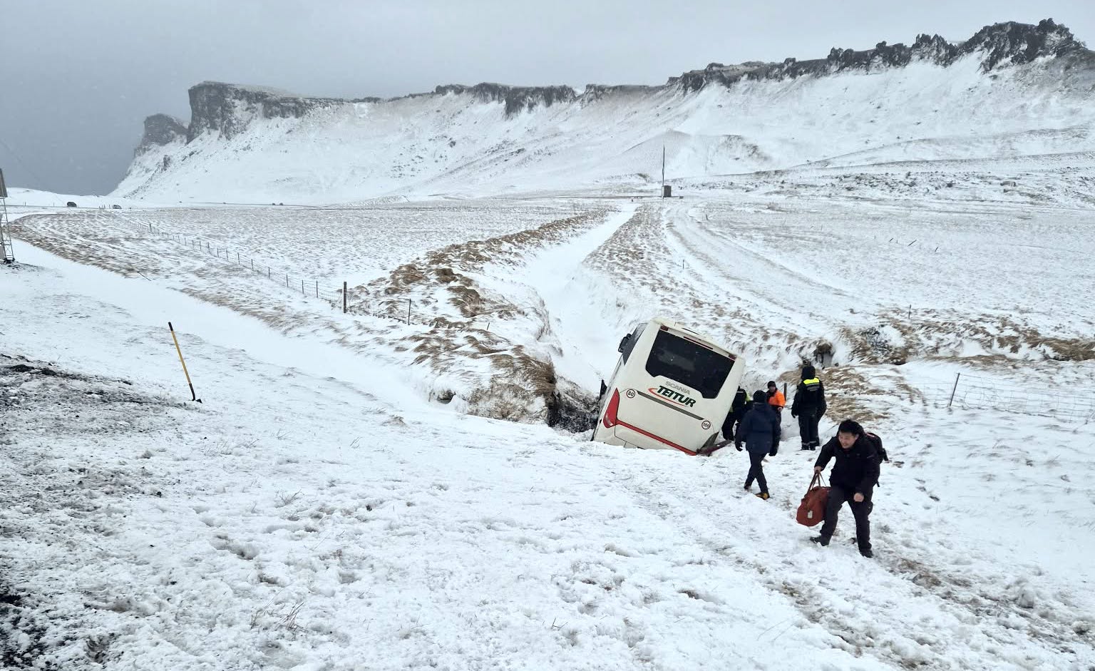 Í tilkynningu frá Landsbjörgu gengu aðgerðir gengu vel og voru allir fluttir í húsnæði Icewear í Vík þar sem fólkið fékk skjól. Rútan var skilin eftir í skurðinum.