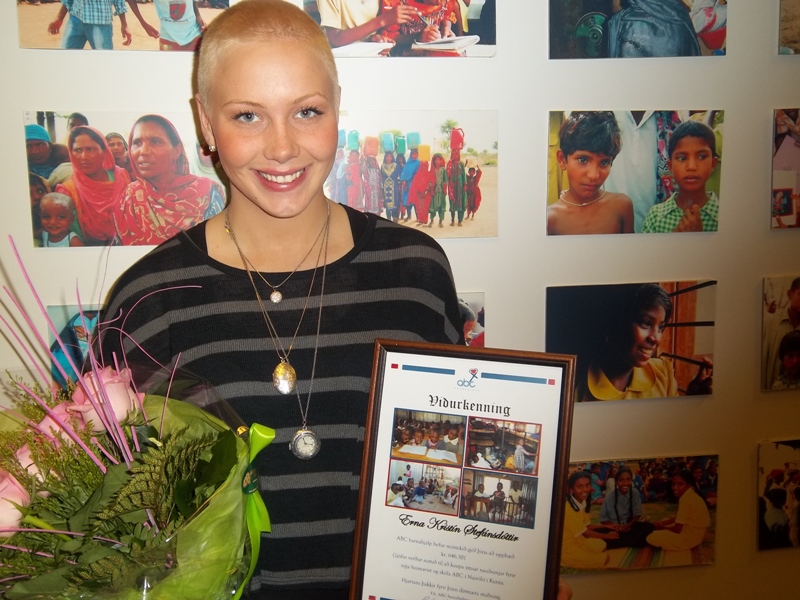 Selfyssingurinn Erna Kristín Stefánsdóttir færði ABC barnahjálp afraksturinn af fjársöfnun sinni fyrr í vikunni en hún lagði hárið að veði til að safna hálfri milljón króna fyrir samtökin.