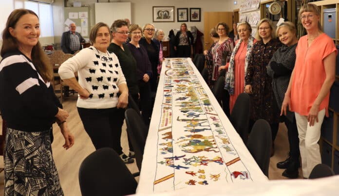Kristín Ragna Gunnarsdóttir, listamaður, er hönnuður verksins og var hún að sjálfsögðu viðstödd þegar síðustu metrunum var rúllað upp. Lilja Einarsdóttir, sveitarstjóri Rangárþings eystra, færði hópnum í Refilstofunni blóm frá sveitarfélaginu og þakkaði fyrir þeirra framlag í þágu menningar í sveitarfélaginu.