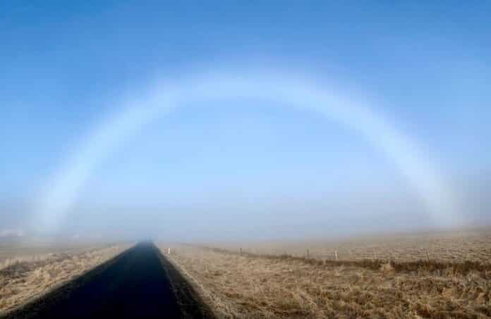 Þegar sólin reis ofar í austri myndaðist sjaldséður þokubogi á vesturhimninum.