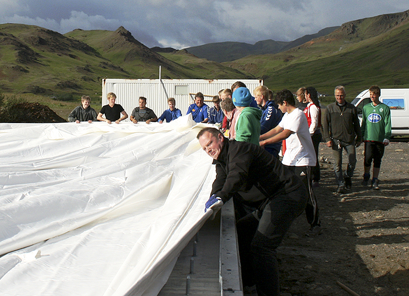 Fjölda sjálfboðaliða úr bæjarfélaginu dreif að á verkstað í gær og var mæting þeirra framar öllum vonum. Verkefnið fólst í að draga út hallardúkinn og að koma honum á rétta staði en hann er níðþungur og því þarf fjölmenni til að færa hann úr stað.