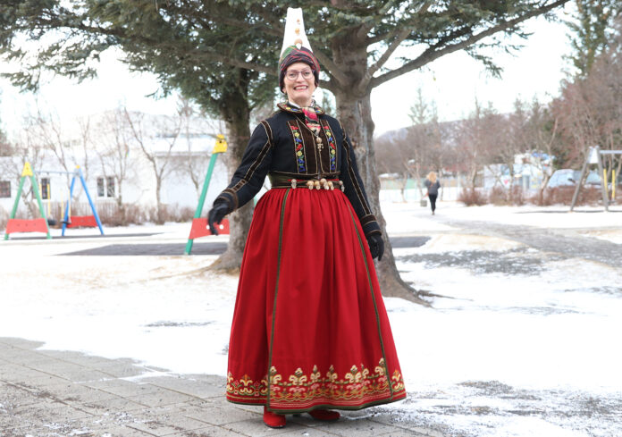 „Ég saumaði hann sjálf, því mig hafði alltaf langað til að eiga búning. Þannig að ég fór á námskeið hjá Hildi Rosenkjær í Annríki og hún sníður allt upp í hendurnar á manni, kennir manni að þræða nál og hún hjálpaði mér þangað til ég var búin og búningurinn fullkláraður,“ bætti Eyrún við.