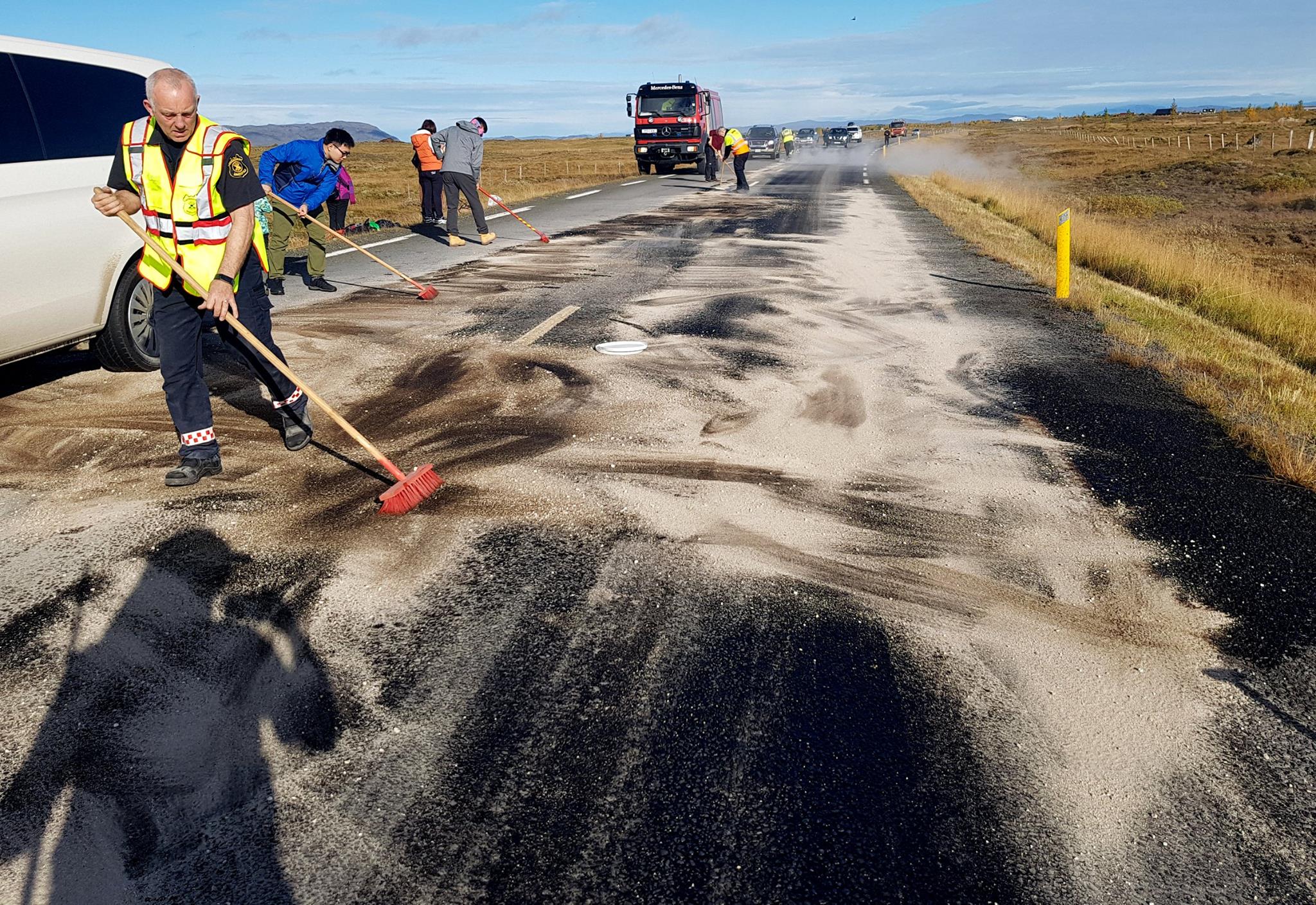 Ekki stóð á ferðamönnunum að hjálpa slökkviliðsmönnunum við upphreinsunina og er þeim þakkað sérstaklega fyrir liðlegheitin í frétt á Facebooksíðu Brunavarna Árnessýslu.