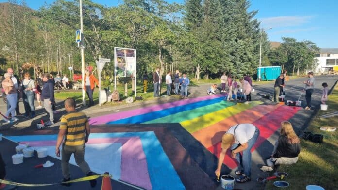 Í tilefni Hinsegin daga var Skólamörk í Hveragerði gerð að regnbogagötu í gærkvöldi, með vaskri framgöngu sjálfboðaliða.