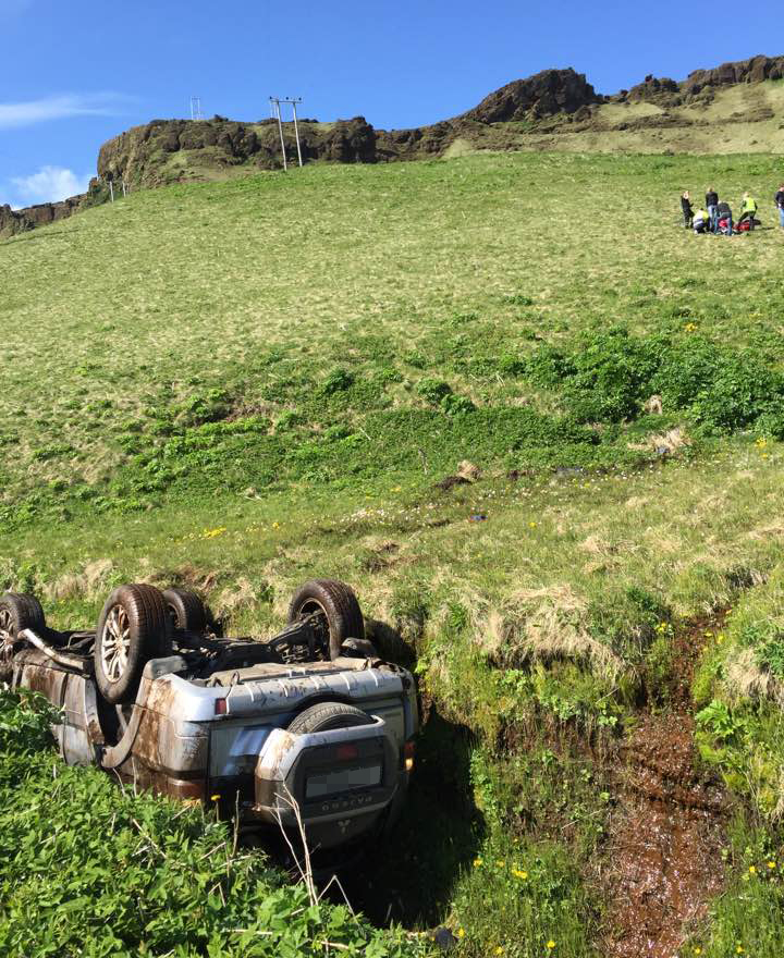 Á miðri leið snerist þeim hugur og ökumaðurinn bjó sig undir að snúa við. Það gekk brösulega og leist farþegum ekki meira en svo á að þeir yfirgáfu jeppann á meðan ökumaðurinn lyki við að snúa við. Ekki tókst betur til en svo að bifreiðin fór aftur á bak útaf veginum og valt margar veltur niður hlíðina og stöðvaðist á hvolfi ofan í skurði. Ökumaðurinn kastaðist út úr bílnum á miðri leið.
