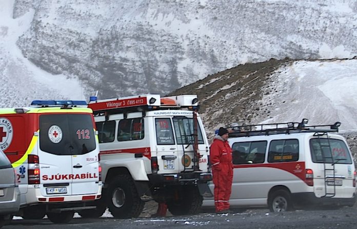 Konan var borin niður í björgunarsveitarbíl sem ók konunni að sjúkrabíl sem beið við rætur fjallsins.