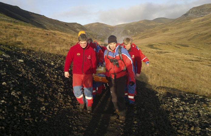 Munu þeir aðstoða sjúkraflutningamenn, sem einnig eru á leið á slysstað, við að koma konunni niður á bílastæðið við Hveragerði þar sem sjúkrabíll bíður þess að flytja hana á sjúkrahús.