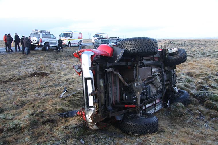 Jeppinn var í lest bíla á leið í jöklaferð með hóp af frönskum ferðamönnum. Ökumaðurinn, sem er franskur, missti stjórn á bílnum í hálku og rann hann útaf veginum og valt, að því er talið þrjár veltur.