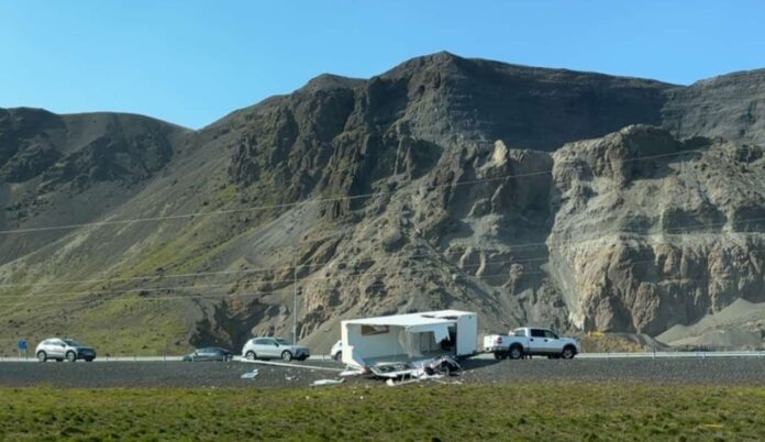 Nokkrir ökumenn lentu í vandræðum þar síðdegis og snemma á sjötta tímanum fauk pallbíll með stóran eftirvagn meðal annars útaf veginum við Þórustaðanámu. Vagninn lenti á ljósastaur og er ónýtur eftir óhappið.