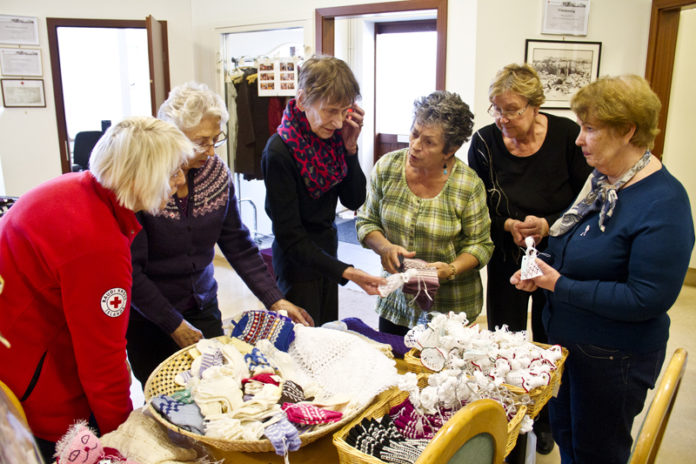 Þar verður til sölu ýmis konar handverk sem unnið er af hópi kvenna sem hittist einu sinni í viku á mánudögum kl. 13 til 16 í Rauða kross húsinu til þess að vinna fallega hluti fyrir basarinn. Þær slá ekki slöku við konurnar því þær eru að mest allt árið og taka sér lítið sumarfrí.