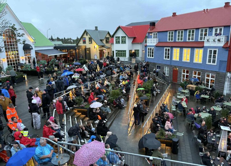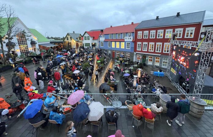 Það er Þjóðhátíðarstemning og fjöldi fólks saman kominn í miðbæ Selfoss í kvöld þar sem dagskrá Þjóðhátíðar í Vestmannaeyjum er sýnd á risaskjá.