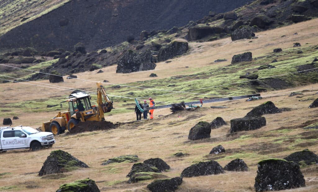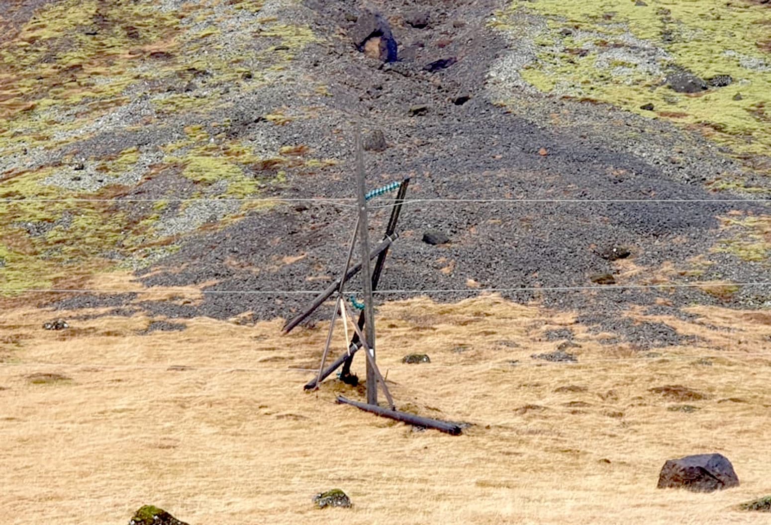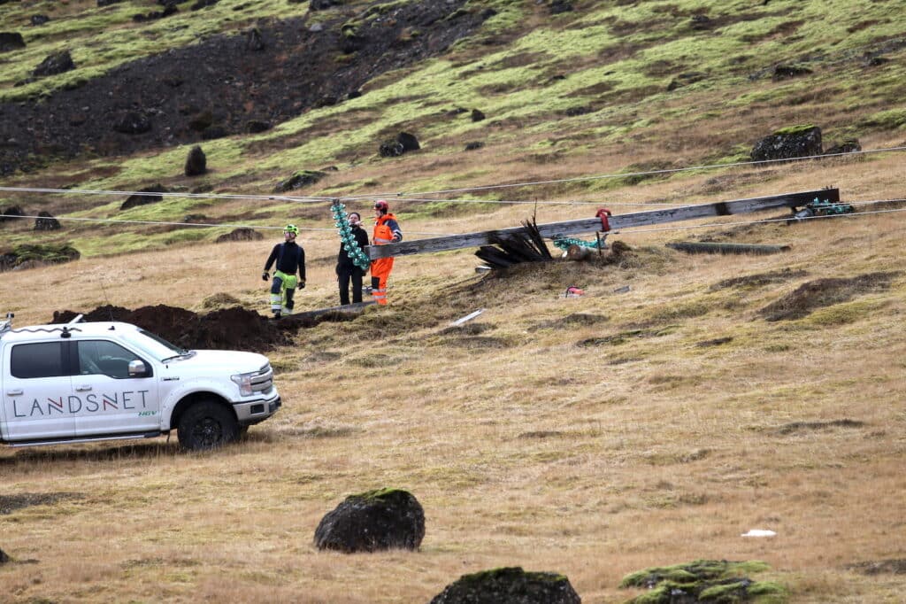 Starfsmenn Landsnets vinna að viðgerð undir Ingólfsfjalli í dag. Greinilegt er að talsverðar leysingar eru í Ingólfsfjalli þar sem nýjar lækjarsprænur renna víða niður hlíðar fjallsins.