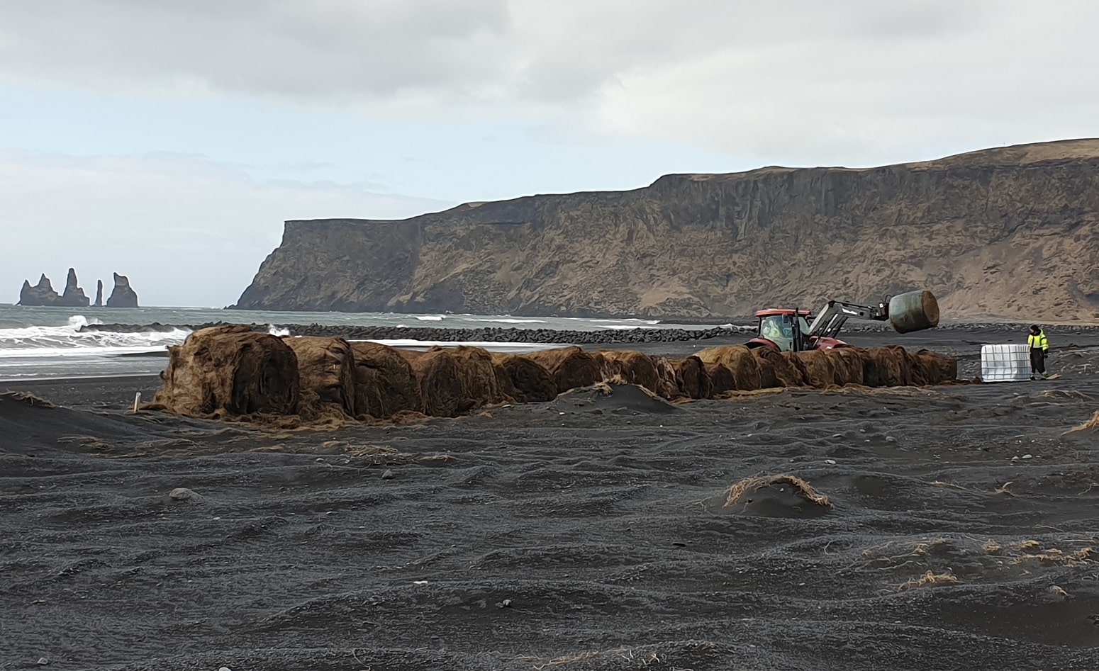 Starfsmenn Landgræðslunnar unnu að því í síðustu viku að raða heyrúllum í Víkurfjöru til þess að stöðva rof í fjörunni.