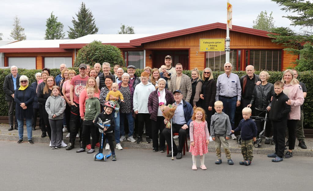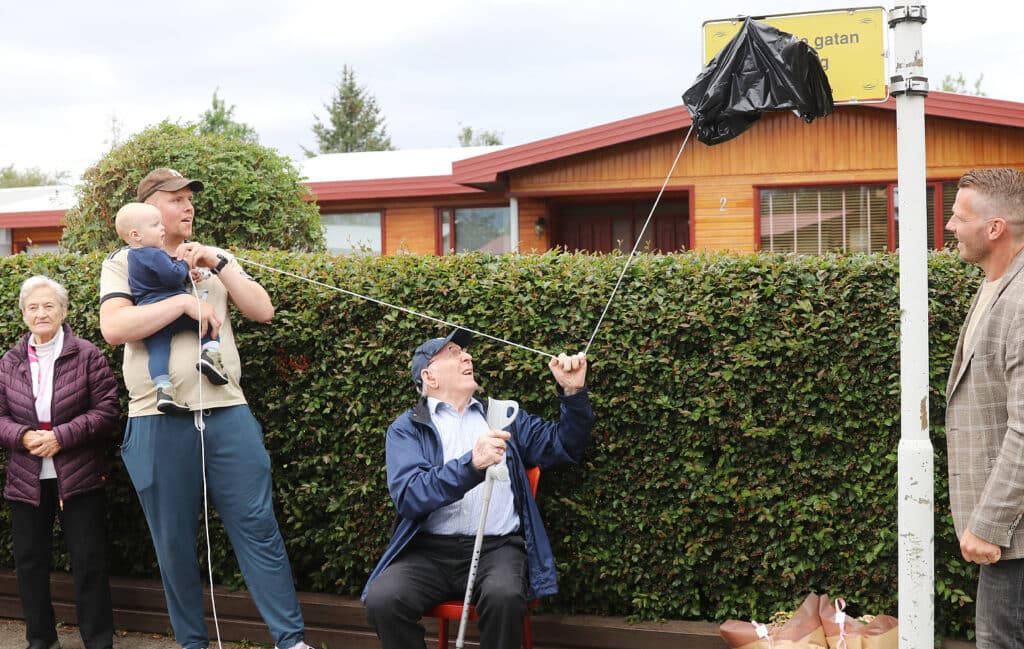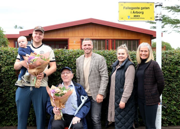 Elsti og yngsti íbúinn í götunni, þeir Jóhannes Guðmundsson 97 ára, fæddur 1926 og Axel Ingi Svavarsson 11 mánaða, fæddur 2022, fengu blómvendi þegar þeir voru búnir að afhjúpa farandskilti sem sett hefur verið upp á ljósastaur fremst í götunni. Þetta er í annað sinn sem Suðurengi hlýtur þessi verðlaun, síðast árið 2008.