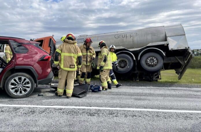 Ekki náðist í lögregluna á Suðurlandi við vinnslu fréttarinnar en samkvæmt heimildarmönnum sunnlenska.is á vettvangi verður vegurinn ekki opnaður aftur fyrr en vörubílnum hefur verið komið upp á veg.