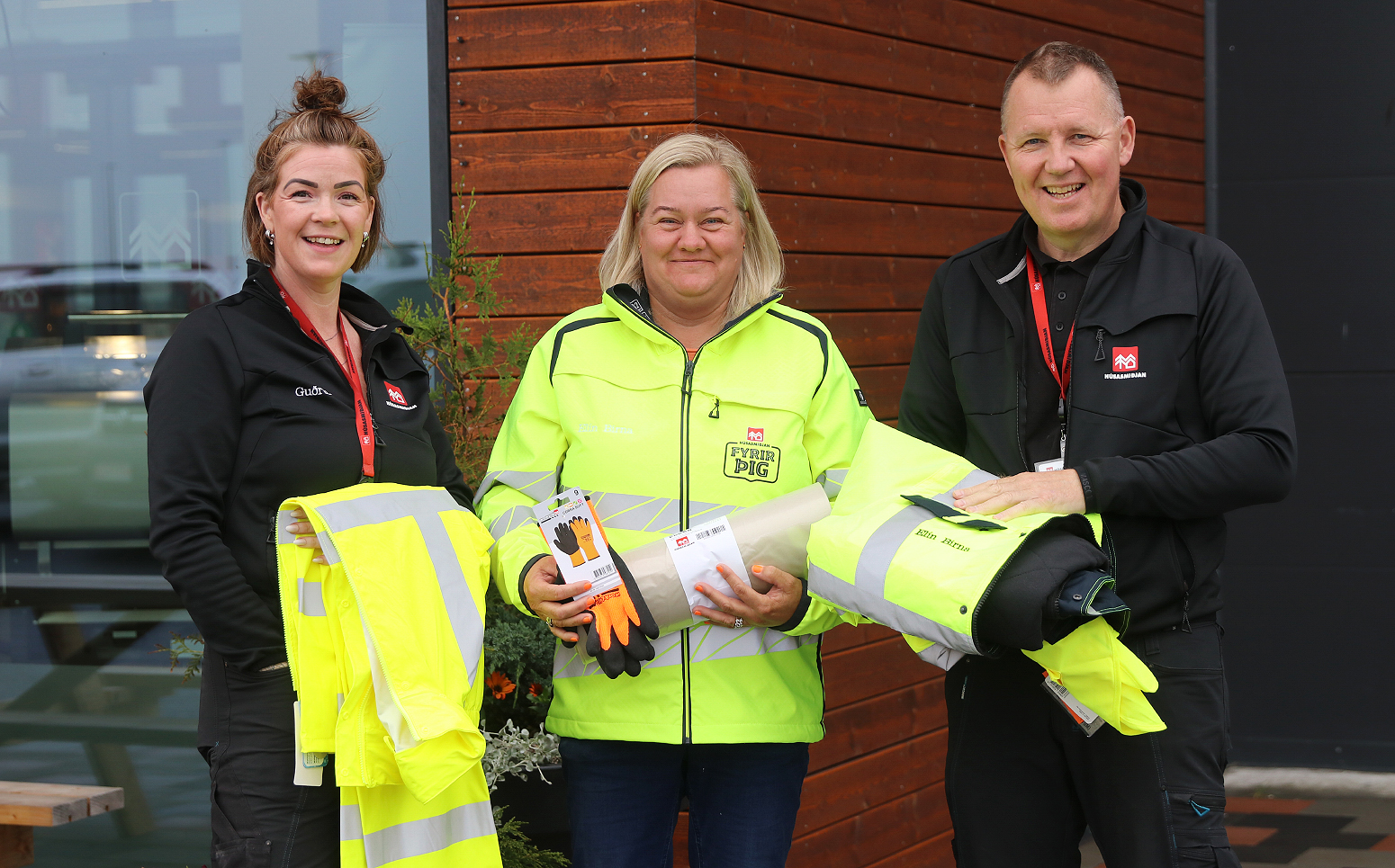 „Það er gott að vera vel merktur núna. Núna sést ég vel, merkt Húsasmiðjunni og ég þakka þeim kærlega fyrir allt það sem þau eru að gefa mér,“ segir Elín Birna sem þegar hún faðmaði Guðrúnu og Sverri fyrir gjafirnar.