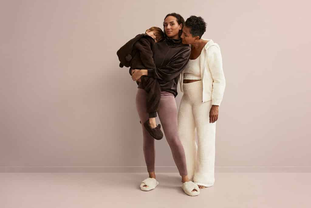 Bleika línan 2021 samanstendur af kósýfötum í hvítum, brúnum og dimmbleikum litum úr velúr, mjúku pile efni og kósý bouclé efni. Í línunni eru bæði dömu-og barnaföt svo bæði móðir og barn geta átt hlýjar kósýstundir saman í vetur.