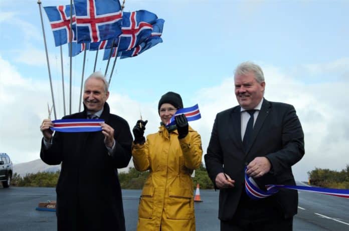 Þingvallavegur var formlega opnaður í dag, á Degi íslenskrar náttúru. Sigurður Ingi Jóhannsson samgönguráðherra, Ari Trausti Guðmundsson formaður Þingvallanefndar og Bergþóra Þorkelsdóttir forstjóri Vegagerðarinnar klipptu á borða á veginum sem hefur verið endurbættur verulega á átta kílómetra kafla frá þjónustumiðstöðinni á Þingvöllum og í austurátt.