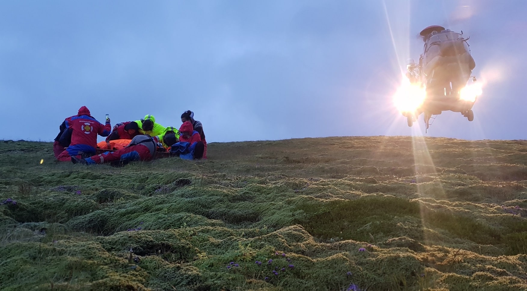 Björgunarsveitarfólk og sjúkraflutningamenn fóru gangandi á staðinn og þegar upp var komið mátu þeir ástand konunnar þannig að réttast væri að kalla eftir þyrlu.