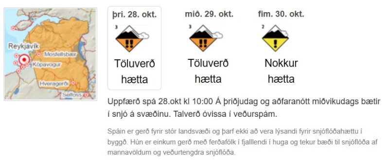 Dálítill snjór var fyrir til fjalla á SV-horninu og ekki er vitað hvernig nýi snjórinn binst við þann eldri. Í svona miklu nýsnævi gæti myndast veikleiki innan snjóþekjunnar eða hún loðað illa saman. Í dag og á næstu dögum má gera ráð fyrir hvassri NA-átt á köflum sem gæti myndað vindfleka, aðallega í SV-vísandi hlíðum, og aukið snjóflóðahættu enn frekar.