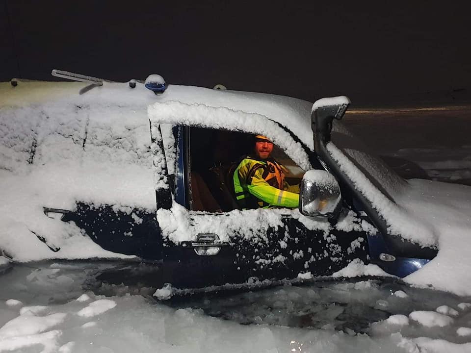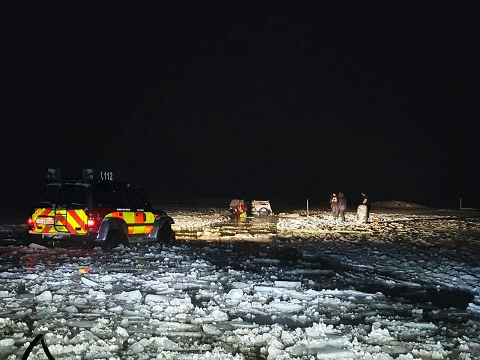 Í gærkvöldi héldu fjórir félagar Hjálparsveitarinnar Tintron í Grímsnesi til aðstoðar eigenda tveggja bifreiða sem höfðu farið niður um ís í gærdag á Eyfirðingavegi, sunnan Skjaldbreiðar.
