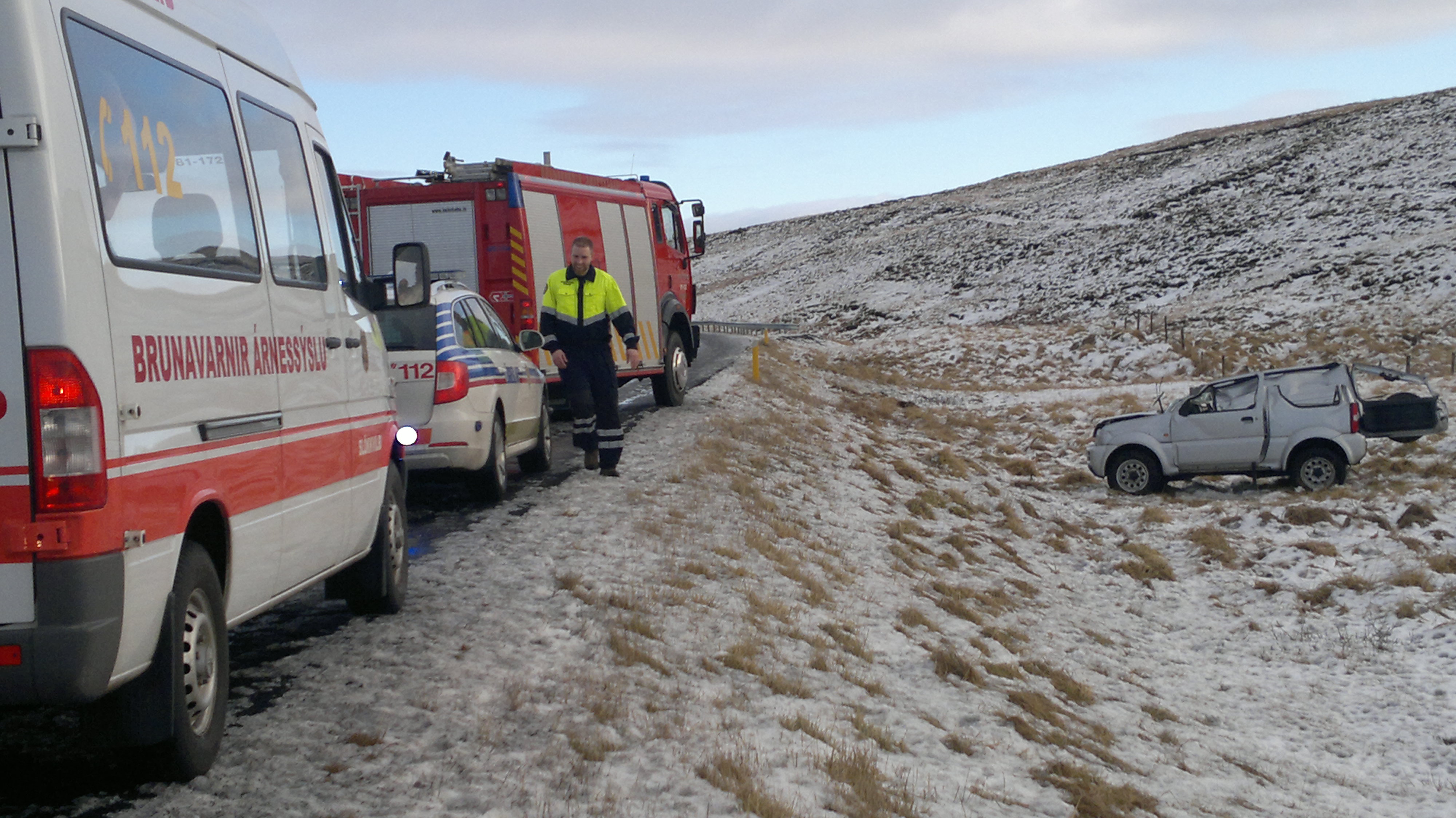Þarna voru á ferðinni erlendir ferðamenn, karl og kona, og voru þau flutt með sjúkrabílum á slysadeild í Reykjavík. Meiðsli þeirra reyndust að öllum líkindum ekki alvarleg.