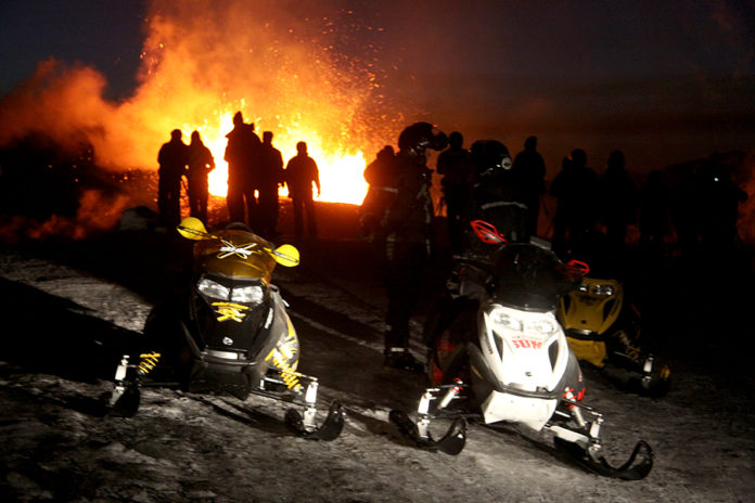 Lögregla og björgunarsveitir sinna gæslu og eftirliti á svæðinu og brýnt er fyrir fólki að fara eftir leiðbeiningum þeirra.