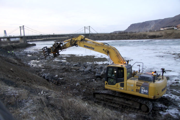 Þar sem stutt er frá götunni að vestasta hluta vegriðsins þurfti að styrkja árbakkann. Beltagrafa frá Ræktunarsambandi Flóa og Skeiða hefur þess vegna verið að athafna sig ofan í árfarveginum þar sem hún raðar stóreflis grjóthnullugum og öðru efni í bakkann.