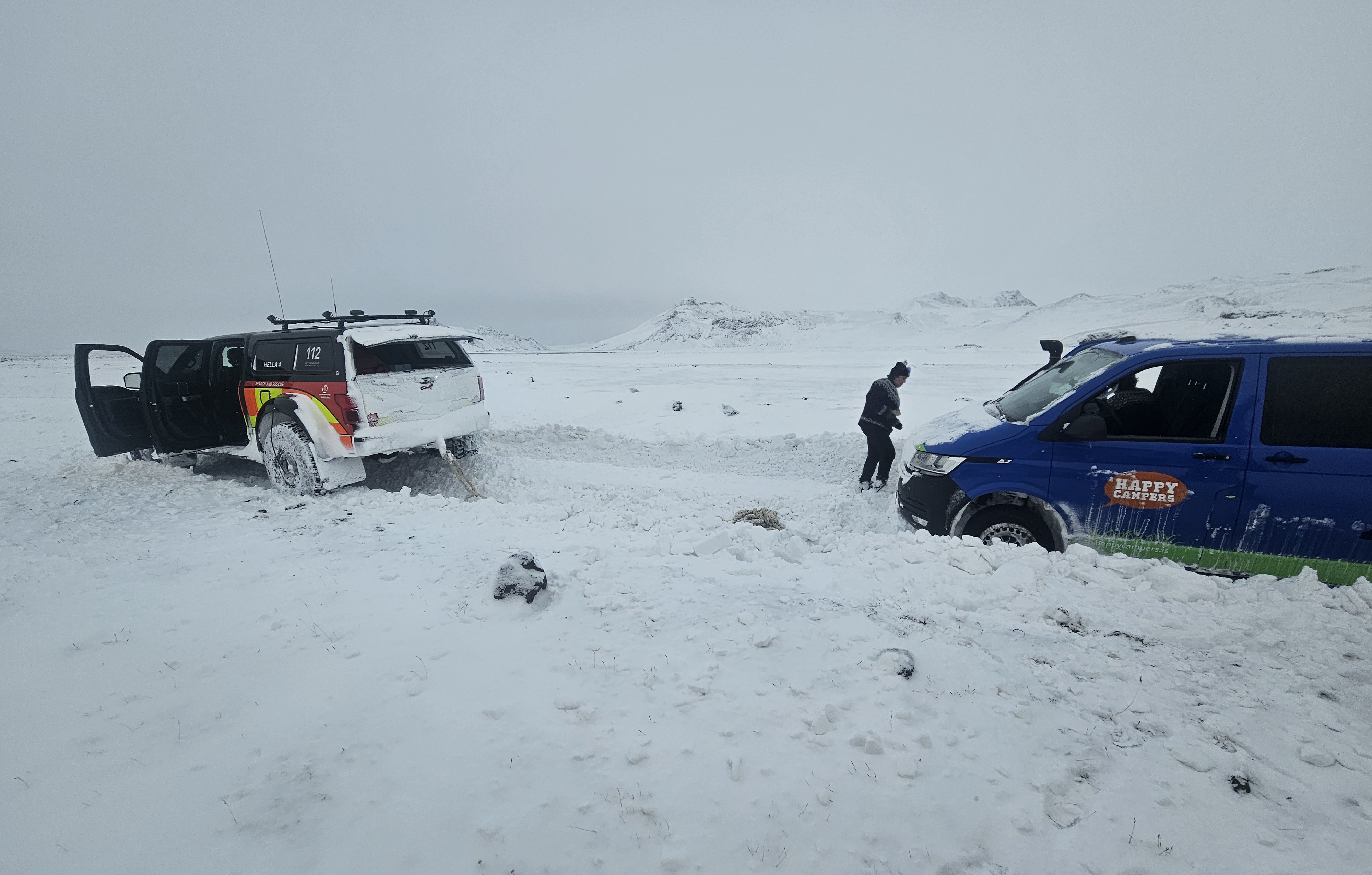 Á Frostastaðahálsi keyrðu svo björgunarsveitir fram á annan ferðalang á jeppa sem hafði fest sig í snjó og var hann einnig aðstoðaður.