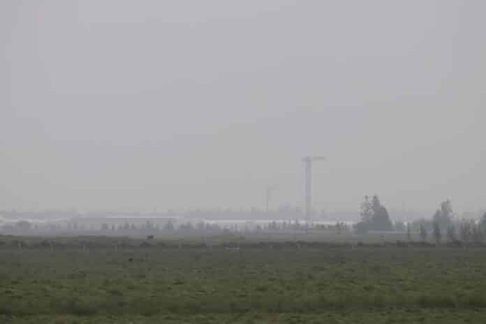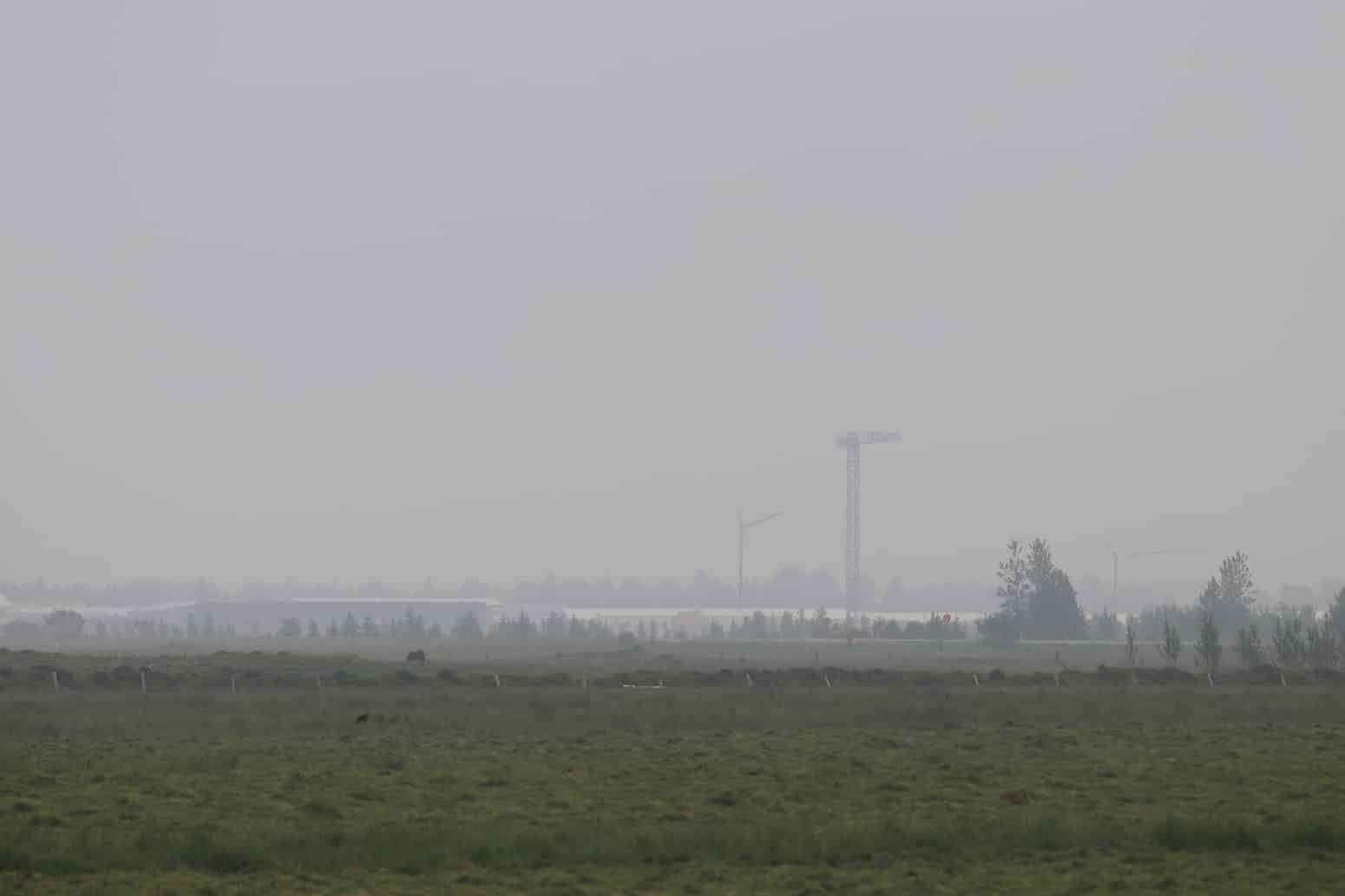 Lítið skyggni er í Ölfusinu og Flóanum þessa stundina, og sjálfsagt víðar á Suðurlandi, vegna blámóðu frá eldgosinu á Reykjanesi. Skyggni er ekki mikið meira en 3-4 km.