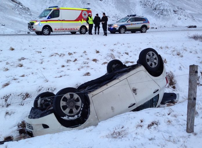 Bíllinn endaði á hvolfi ofan í skurði og átti ökumaðurinn, kona á þrítugsaldri, ekki auðvelt með að komast út úr bílnum í kjölfarið. Því var kallaður út tækjabíll frá Brunavörnum Árnessýslu, en aðstoð hans var svo afturkölluð eftir að konan komst út um afturhlera bílsins. Hún var ein á ferð og voru meiðsli hennar ekki alvarleg.