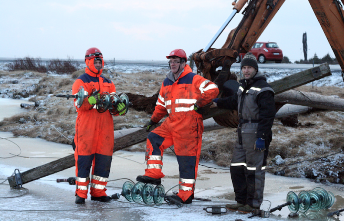 Starfsmenn RARIK eru þessa dagana að taka niður rafmagnsstaura og rafmagnslínur við suðurströndina, og voru við Eyrarbakka á dögunum.