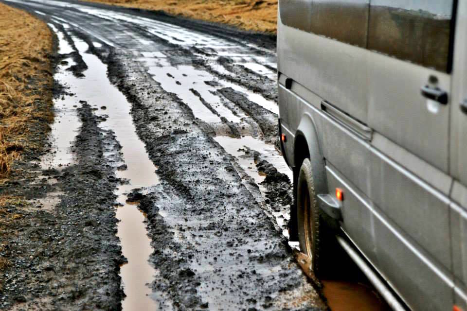 Hann er búinn að fá sig fullsaddann af malarvegum, sem hann ekur fjórum til sex sinnum á dag í vinnu sinni. Fyrr í vikunni var hann næstum því búinn að festa skólabílinn í drullusvaði en Sigurður segir vegina vera nánast einn drullupytt.