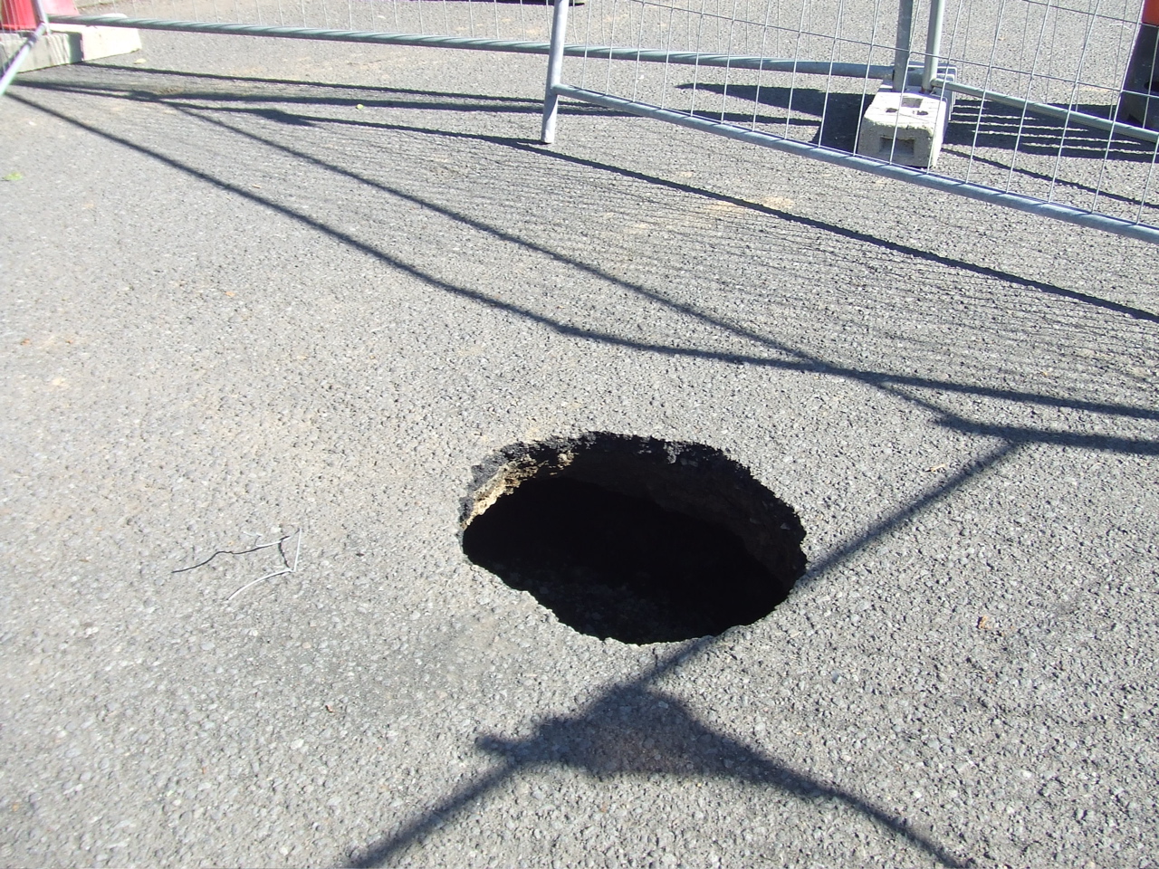 Gatið í malbikinu er um hálfur meter í þvermál en undir því er stærra holrúm, metersdjúpt og líklega um tveir fermetrar.