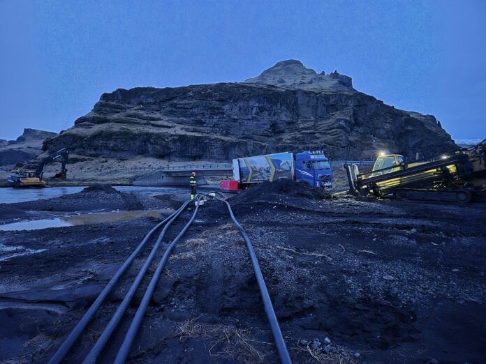 Viðgerð hófst í gær með því að boruð voru mjó göng undir árfarveg Skógár og rör dregin í gegnum þau. Jarðstrengirnir verða svo dregnir þar í gegn. Samstarfsaðilar RARIK hjá verktakafyrirtækinu Þjótanda hófu borunina rétt eftir hádegi í gær og luku verkefninu um klukkan 5 í nótt.